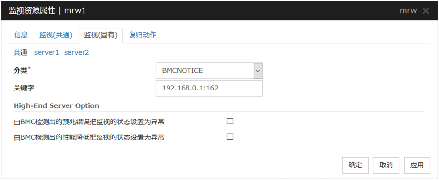 [种类]框中输入BMCNOTICE,[关键字]框中则输入可与各服务器的 BMC进行通信的OS端的IP 地址作为异常发生通知的通知目标 IP 地址。IP 地址因服务器不同而异,因此请务必进行个别设置。此事例中输入192.168.0.1 到[共通] 和 [server1]中,输入192.168.0.2 到[server2]。