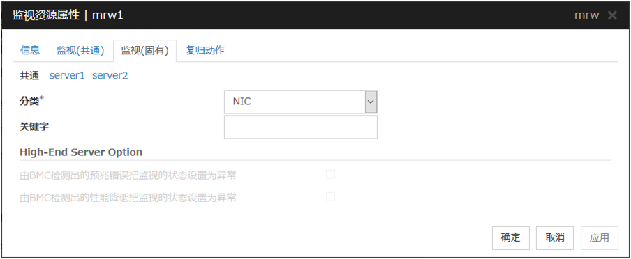 通过将消息接收监视资源设置为与Express5800/A1080a,A1040a 系列整合,搭载在服务器的 BMC 查出异常时发出异常通知,使复归动作执行。