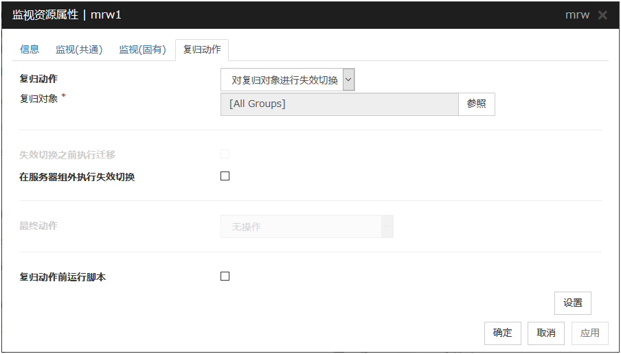 执行复归脚本监视器查出异常时,执行复归脚本。 重启复归对象监视器查出异常时,重启选中为复归对象的组或组资源。 针对复归对象执行失效切换监视器查出异常时,针对选中为复归对象的组或组资源所属组执行失效切换。 执行最终动作监视器查出异常时,执行选中为最终动作的动作。