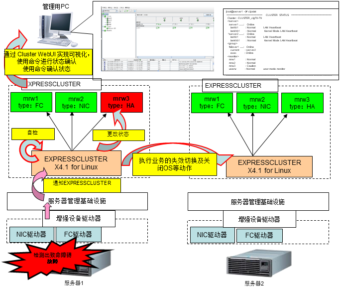 Express5800/A1080a,A1040a 系列整合指当搭载在服务器的BMC查出异常时,通过与EXPRESSCLUSTER整合,使交接业务可确实执行的功能。