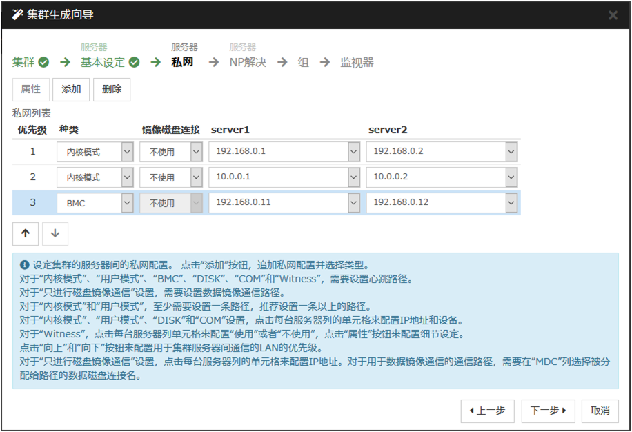 设置构筑集群的服务器间的网络构成。设置BMC 心跳资源为Express5800/A1080a,A1040a系列整合固有的项目。