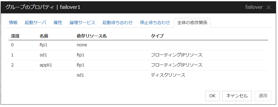 - リソース名を指定してリソースの依存関係を追加します。resourcetype、resourcenameにリソースタイプとリソース名を設定し、dependresourcenameに依存するリソース名を指定します。グループリソースに依存関係を設定した場合、活性時はdependresourcenameの活性化が完了してから、resourcenameに指定したグループリソースの活性化が開始されます。非活性時はresourcenameに指定したグループリソースの非活性化が完了してから、dependresourcenameの非活性化が開始されます。例として該当グループに所属するリソースの依存する深度を一覧で表示します。