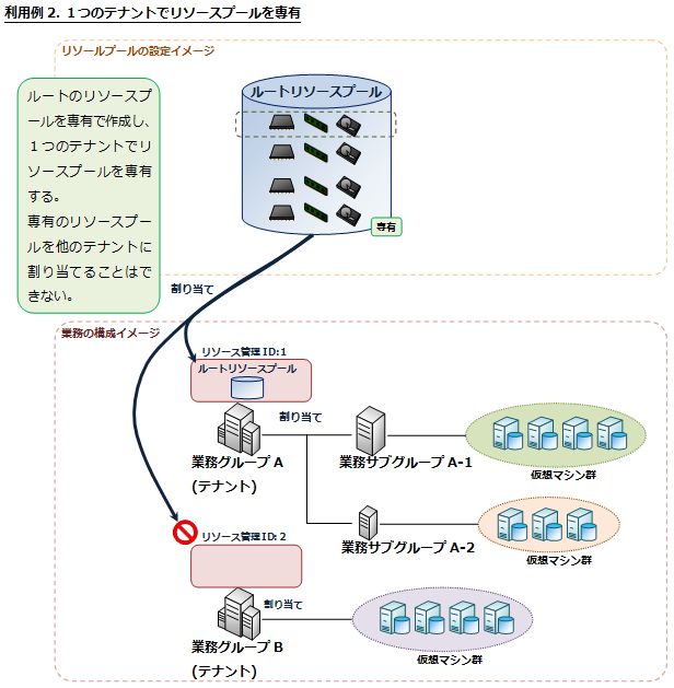 リソースプールの機能を簡易に利用したい場合の利用方法です。リソース使用状況の閲覧や仮想マシンの配置先となる仮想マシンサーバの範囲を指定することができます。本利用法ではテナント運用を行うことはできません。