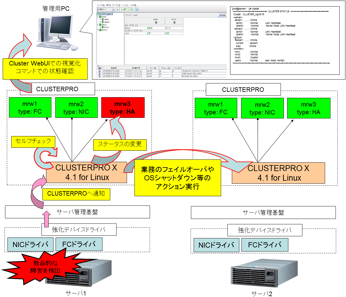 • 強化デバイスドライバがシステムに致命的な障害を検知した場合に、CLUSTERPRO X と連携しフェイルオーバする機能