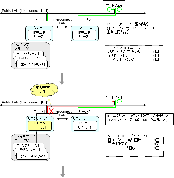 モニタリソースとは、指定された監視対象を監視するリソースのことを指します。監視対象の 異常を検出した場合には、グループリソースの再起動やフェイルオーバなどを行います。