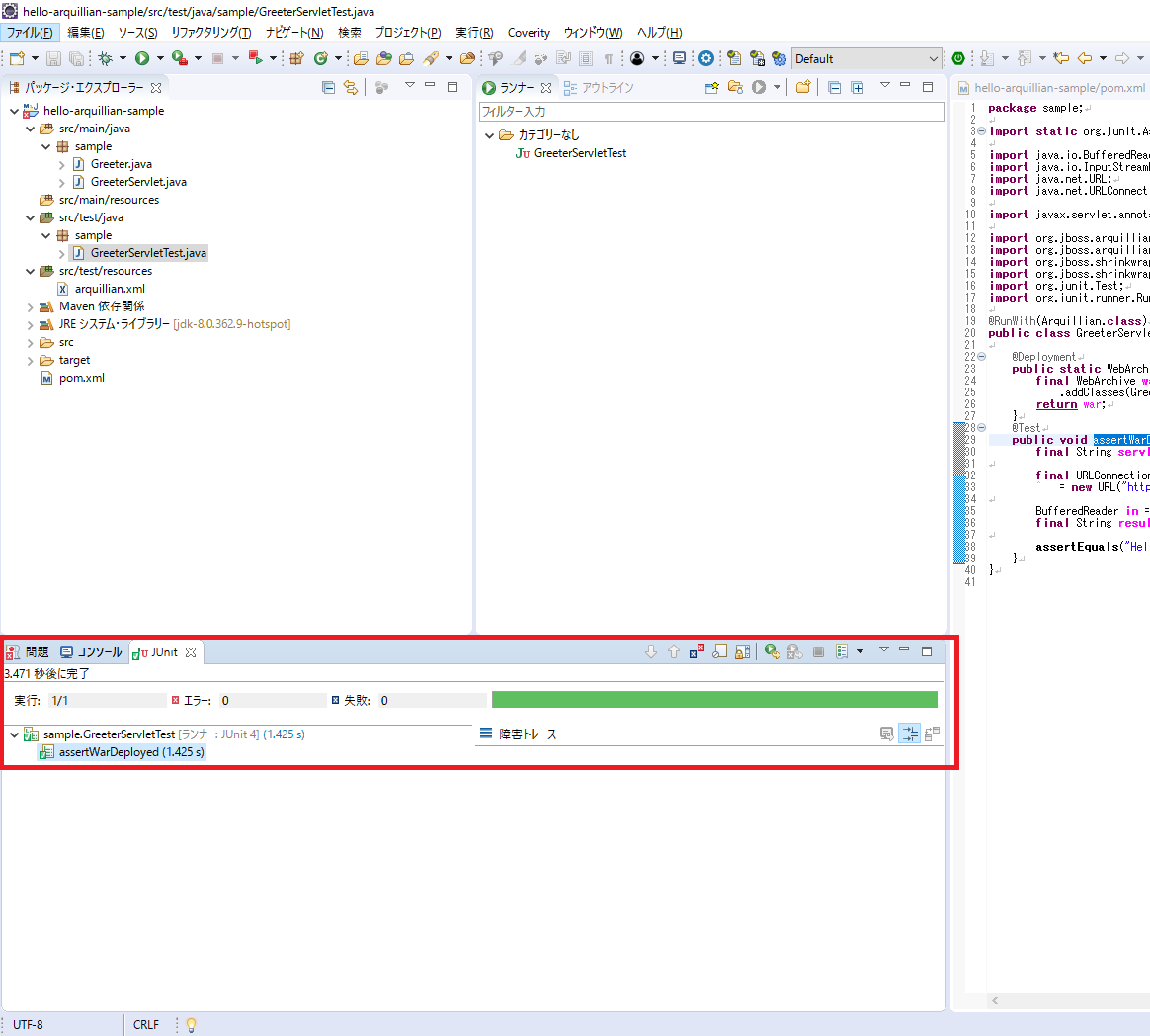 java.lang.IllegalStateException: Error launching test sample.GreeterServletTest public void sample.GreeterServletTest.assertWarDeployed() throws java.lang.Exception