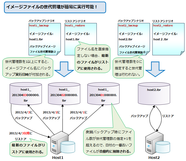 バックアップシナリオにファイル世代管理数の設定を行うことで、イメージファイルを指定数+1分の複数の世代で管理することが可能になります。