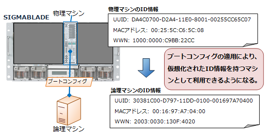 登録対象のブレードが格納されるSIGMABLADE筐体を指定して、RegisterMachinevIO.batを実行すると、次のイメージ図のように、指定のSIGMABLADE筐体内の全ブレードについて、ブートコンフィグの適用状況に応じて論理マシンと物理マシンの2種類のマシンが[リソース]ビューとDeploymentManagerに登録されます。対象のSIGMABLADE筐体は、SIGMABLADEに搭載されるEMカードのフローティングIPアドレスにより指定します。
