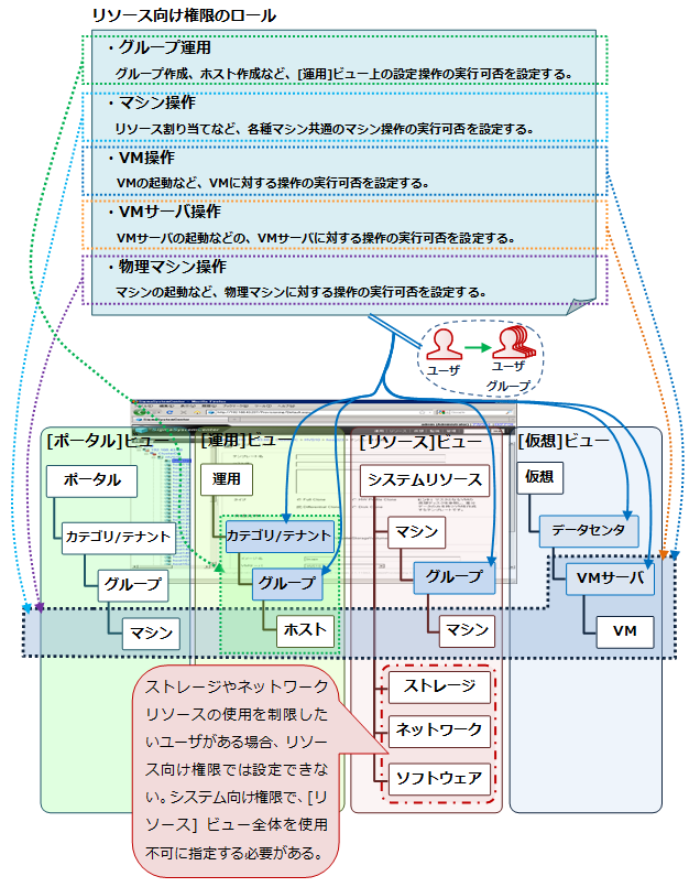 リソース向け権限のロールは、[運用]ビューのグループやホスト、物理マシン、仮想マシン、仮想マシンサーバといったSigmaSystemCenterが管理や制御を行う対象に対して、個別に操作の制限を設定するためのものです。以降、リソース向け権限のロールを、ロール(リソース)として説明します。