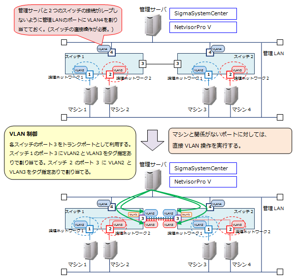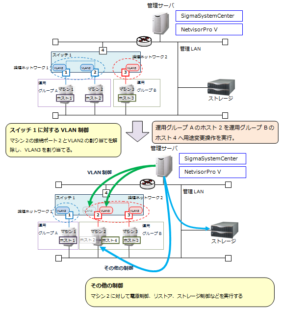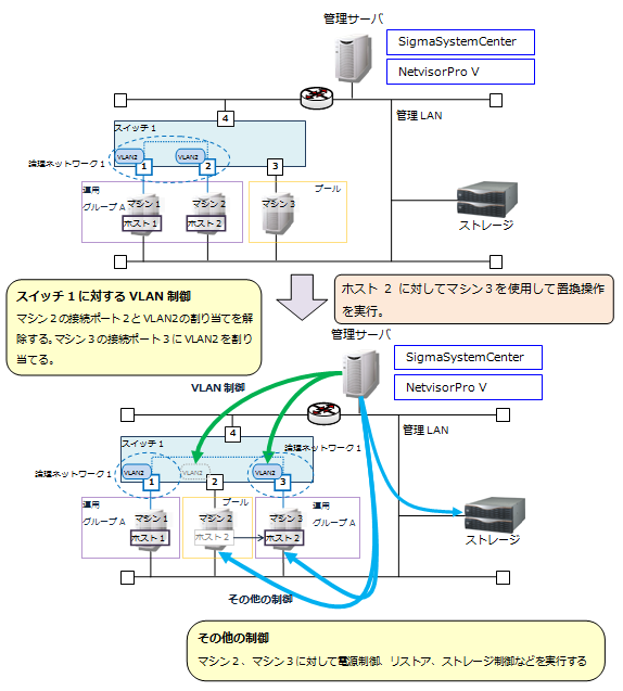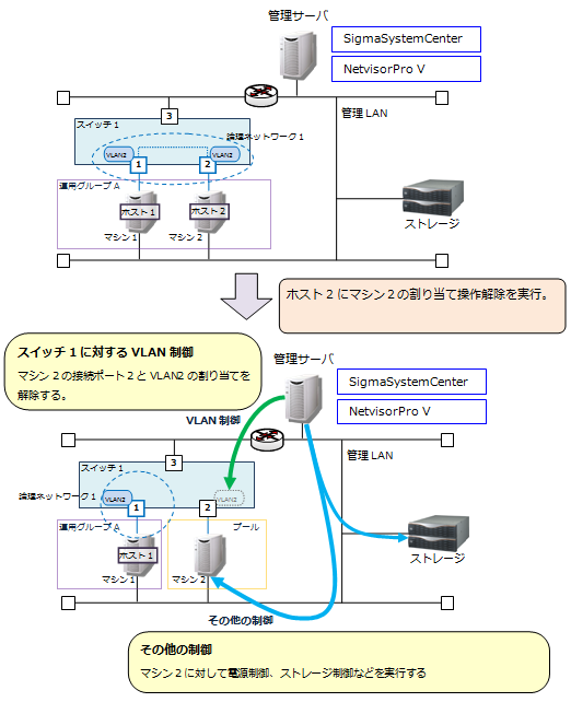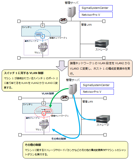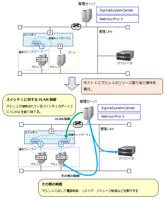 SigmaSystemCenterの運用操作を実行したときに、SigmaSystemCenterが行うVLAN制御の動作について説明します。