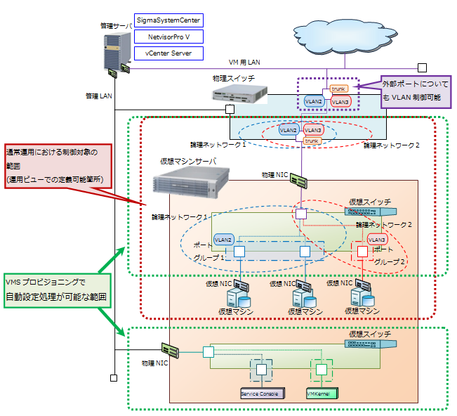なお、通常の運用操作では、管理LAN側の仮想マシンサーバの設定(VMwareの場合、ServiceConsoleやVMKernelのポートグループやIPアドレスの設定など)の処理を行うことができません。そのため、これらの設定については、仮想化基盤製品を使用して仮想マシンサーバに対して直接設定を行う必要があります。仮想マシンサーバ上のネットワークの設定をすべて一通り自動で行うためには、下記の仮想マシンサーバプロビジョニングを利用する必要があります。