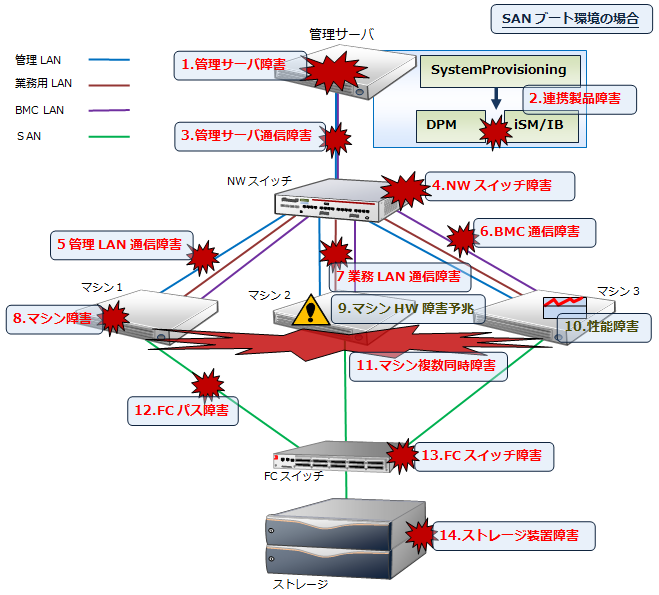 2 | 連携製品障害 | DPMやiSM/IBなどの障害 | DPM:VM作成不可/パッチ・AP適用不可、iSM/IB:ストレージ制御不可 | 各製品のサービス再起動など | 連携動作時に障害を検出。