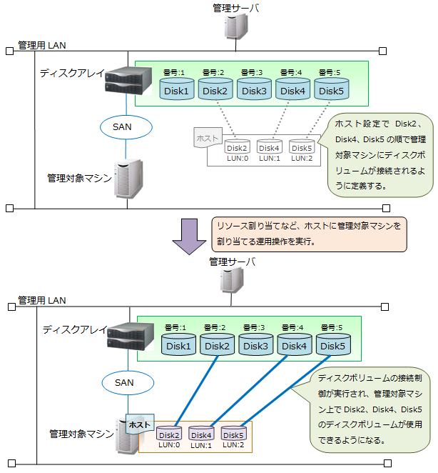 リソース割り当てやマスタマシン登録などの運用操作により、ディスクボリュームと管理対象マシンとの接続を行います。