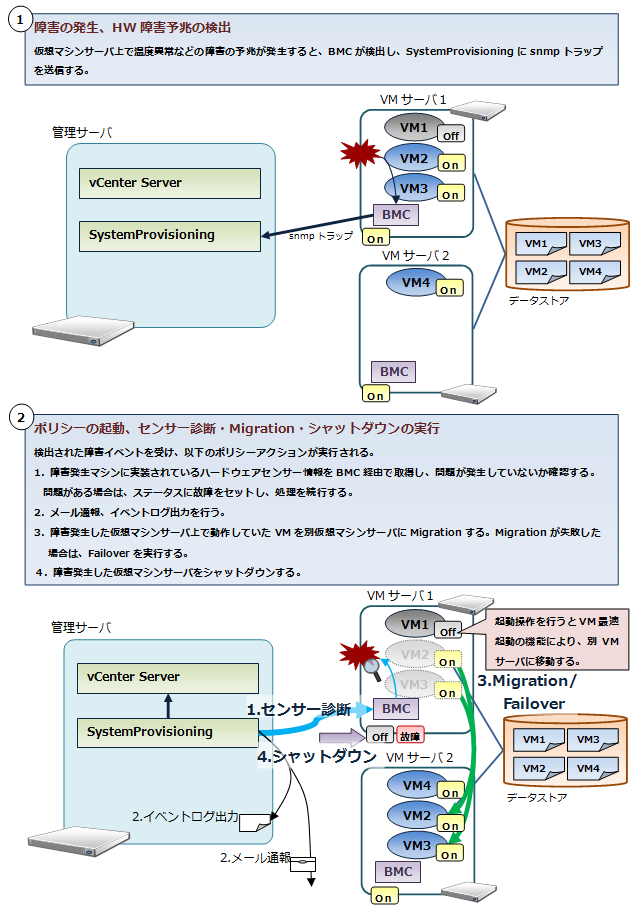 前述の仮想マシンサーバダウン時のVM退避では障害発生時に一時的に業務停止が発生しますが、本機能を利用することで仮想マシンサーバの障害を事前に回避できるため、業務をできるだけ停止しないような運用が可能になります。
