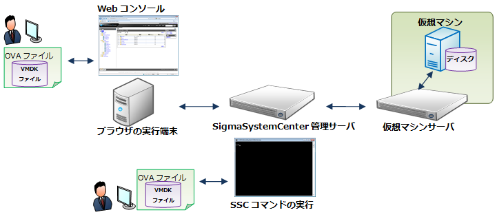 SigmaSystemCenterの管理サーバを経由して、データの受け渡しが行われるため、管理サーバ上にも作業領域として外部ファイルのサイズ分の空き領域が必要です。作業領域は、環境変数TEMPの設定場所が利用されますが、ssc update environment TempWorkingDirコマンドにより、明示的に指定することも可能です。