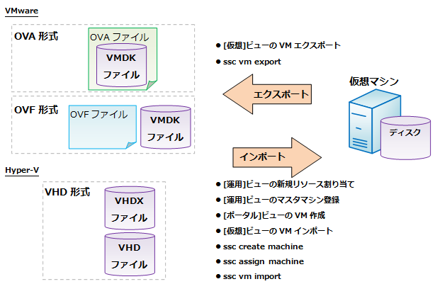 各仮想化基盤製品で標準で提供されるファイル形式(OVAやVHD)に対応しているため、他の管理ツール上でエクスポートしたファイルから仮想マシンを作成するときに利用できます。 インポート/エクスポートの機能は、VMwareとWindows Server 2012以降のHyper-Vで利用できます。