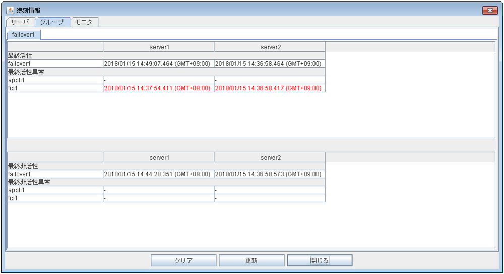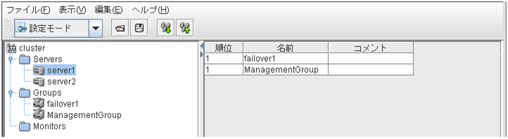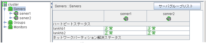 サーバ、グループリソース等の各クラスタ資源の状態が確認できます。詳しくは「 2.3. WebManager のツリービューで各オブジェクトの状態を確認するには 」を参照してください。