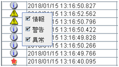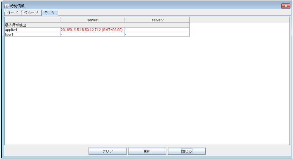 アラート検索を実行します。[ツール] メニューの [アラート検索] を 選択するのと同じです。 ログを採取します。[ツール] メニューの [クラスタログ採取] を選択するのと同じです。 リロードを実行します。[ツール] メニューの [リロード] を選択 するのと同じです。 オプションを表示します。[ツール] メニューの [オプション] を選択するのと同じです。 時刻情報を表示します。[ツール] メニューの [時刻情報] を選択するのと同じです。時刻情報が更新された場合、アイコンが変わります。時刻情報ダイアログを表示するとアイコンは元に戻ります。 統合マネージャを表示します。[ツール] メニューの [統合マネージャ] を選択するのと同じです。