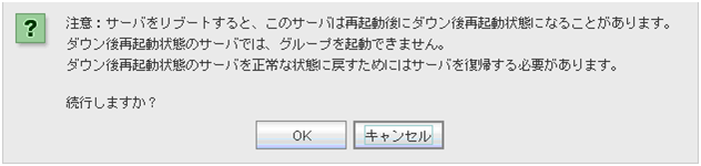 検証モード] を選択すると検証モードに切り替わります。ただし、操作制限するように登録されたクライアントから WebManager に接続した場合には、検証モードに切り替えることはできません。また、検証モードから、他のモードに切り替えると、「全てのモニタの擬似障害を停止しますか?」というダイアログが表示されます。「はい」を選択すると、擬似障害発生状態のモニタリソースが、全て通常の監視に戻ります。「いいえ」を選択すると、擬似障害発生状態のモニタリソースは、擬似障害発生状態を維持したまま他のモードに切り替わります。注釈