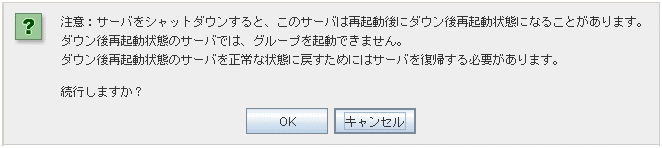 検証モード] を選択すると検証モードに切り替わります。ただし、操作制限するように登録されたクライアントから WebManager に接続した場合には、検証モードに切り替えることはできません。また、検証モードから、他のモードに切り替えると、「全てのモニタの擬似障害を停止しますか?」というダイアログが表示されます。「はい」を選択すると、擬似障害発生状態のモニタリソースが、全て通常の監視に戻ります。「いいえ」を選択すると、擬似障害発生状態のモニタリソースは、擬似障害発生状態を維持したまま他のモードに切り替わります。注釈