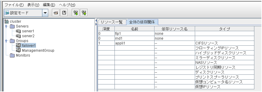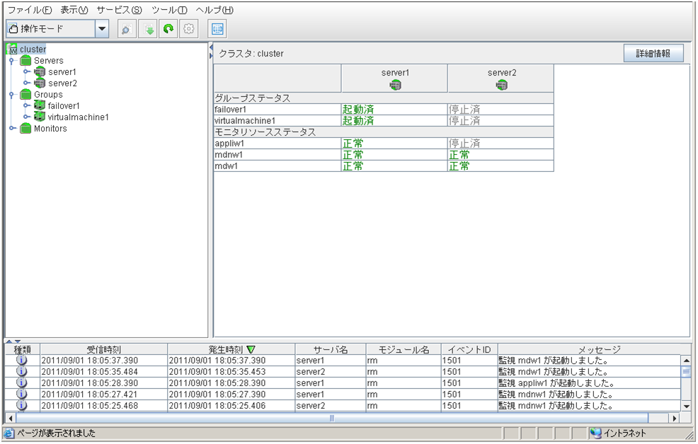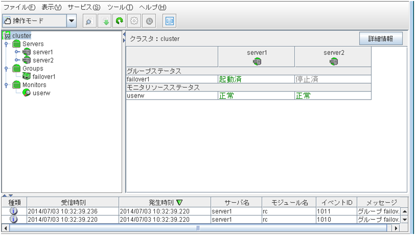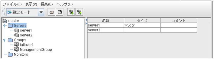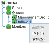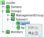サーバ、グループリソース等の各クラスタ資源の状態が確認できます。詳しくは「 2.3. WebManager のツリービューで各オブジェクトの状態を確認するには 」を参照してください。
