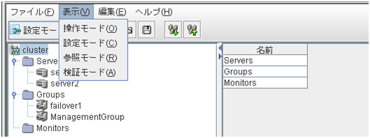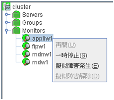 - 検証モード任意のモニタリソースで擬似障害を発生/解除させるためモードです。[表示] メニューの [検証モード] を選択するか、ツールバーのドロップダウンメニューで [