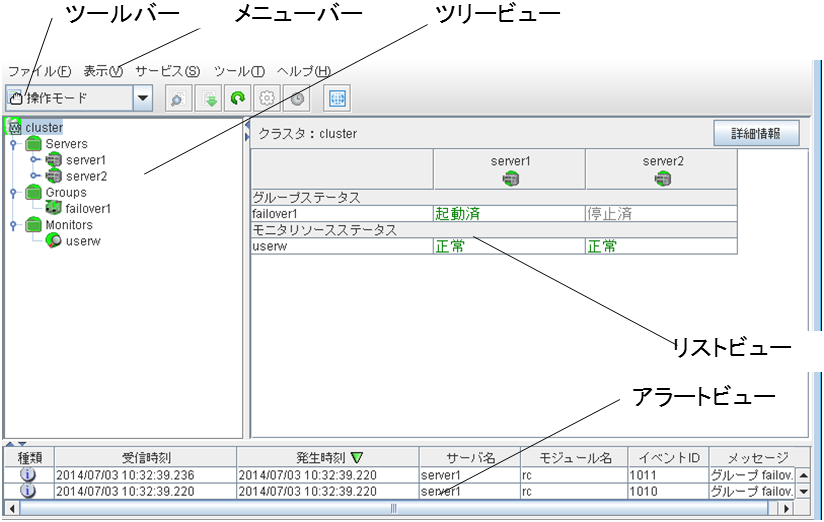 CLUSTERPRO 動作状況がメッセージとして表示されます。詳しくは「 2.5. WebManager でアラートを確認する」を参照してください。