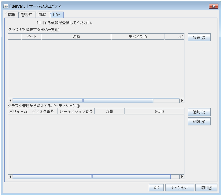 HBA の設定が正しいか確認してください。パーティションが使用中の可能性があります。確認してください。 |