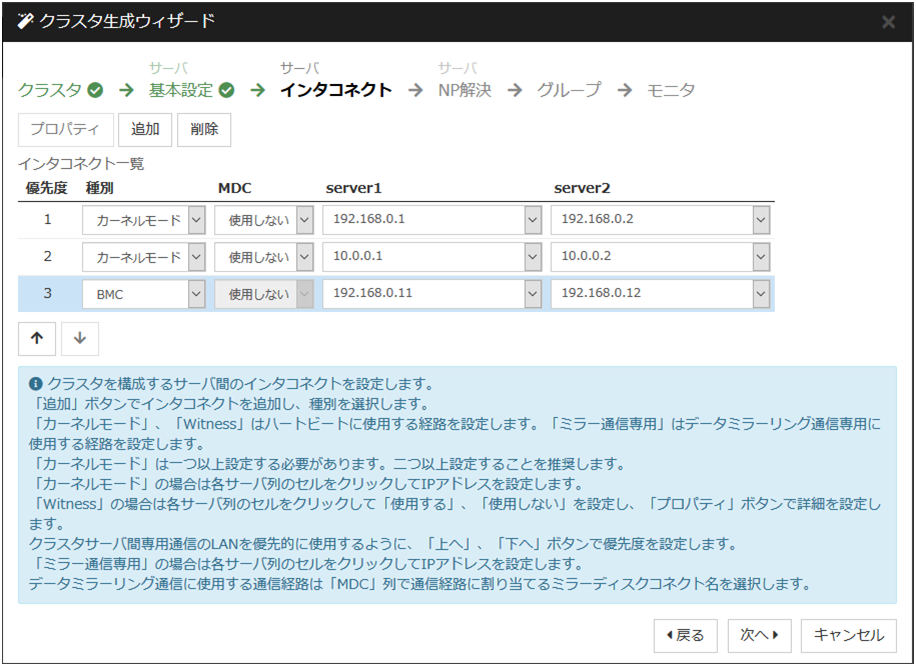 クラスタを構築するサーバ間のネットワーク構成を設定します。Express5800/A1080a,A1040a シリーズ連携固有の項目として、BMC ハートビートリソースを設定します。