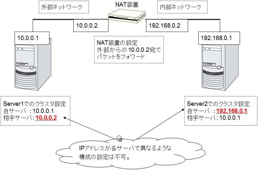 - フェイルオーバが発生したとき、クライアントのアプリケーションが接続先サーバの切り替えを意識することなく使用できる IP アドレスクラスタサーバが所属する LAN と同一のネットワーク アドレス内で、他に使用されていないホストアドレスを割り当てる