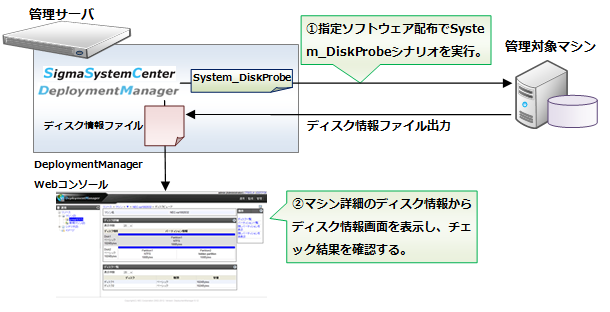 Webコンソールの場合、指定ソフトウェア配布の操作でSystem_DiskProbeシナリオを指定して実行します。sscコマンドの場合、ssc deploy softwareコマンドで実行することができます。