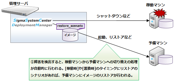 このとき、予備の管理対象マシンに対して、障害発生前の管理対象マシンのディスクイメージがリストアされます。