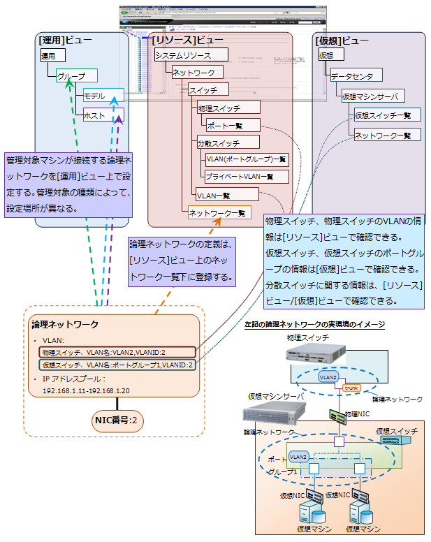 物理マシン | ・[運用]ビュー-グループプロパティ設定-[ネットワーク設定]タブ ・[運用]ビュー-モデルプロパティ設定-[ネットワーク設定]タブ | 設定した論理ネットワークに仮想設定が含まれていた場合、仮想設定は無視します。 両方に設定がある場合は、モデルプロパティ設定-[ネットワーク設定]タブが優先され、グループプロパティ設定-[ネットワーク設定]タブの設定は無視されます。 |