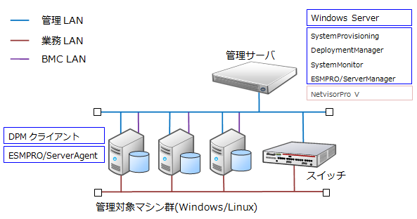 管理サーバと管理対象マシンは、管理LANを経由して接続できるようにする必要があります。管理LANでは、主に監視、バックアップ・リストア、アプリケーション・パッチ配布、電源制御などで使用します。また、BMC(OOB管理)を利用して電源管理や障害監視を行うために管理サーバから管理対象マシンに搭載されるBMCに接続できるようにする必要があります。