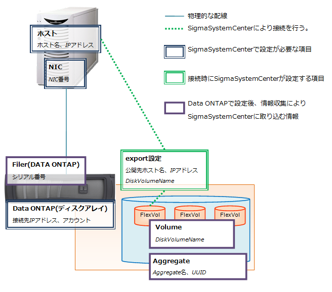 接続制御の際、ディスクアレイに接続して制御を行うため、Data ONTAPのIPアドレス、アカウントの接続情報が必要です。