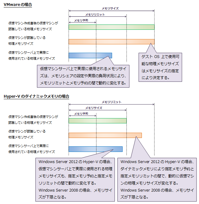 Hyper-Vのダイナミックメモリの場合、メモリサイズの指定は仮想マシンの物理メモリサイズの初期設定として使用されます。その後ダイナミックメモリにより動的に物理メモリサイズが変わるため、メモリリミットの設定は動的に変更される仮想マシンの物理メモリサイズの上限として使用されます。Hyper-Vの場合、メモリ予約は仮想マシンの物理メモリサイズの下限として使用されます。