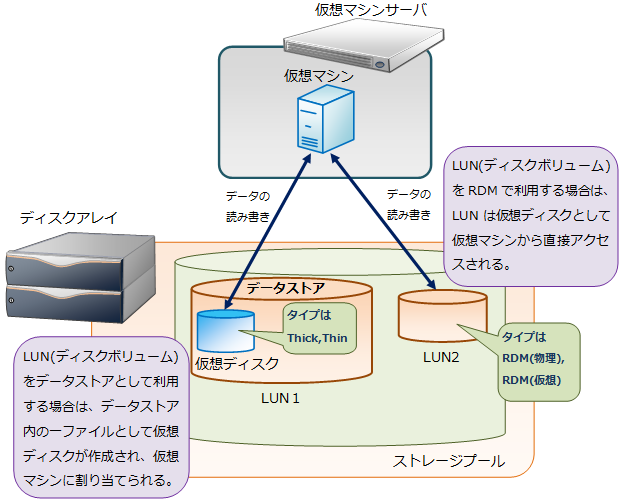 Raw Device Mapping(以降、RDMと記載する)は、仮想化基盤製品上でデータストアとして管理されていないストレージのLUN(ディスクボリューム)を、仮想マシンのディスクとして、仮想マシンから直接アクセスできるようにする機能です。