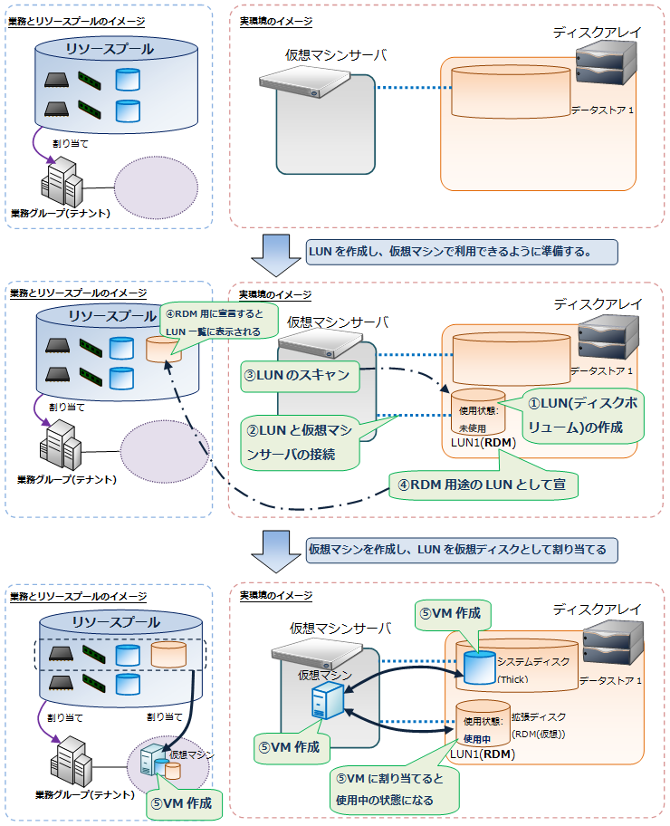 RDM用に使用するLUN(ディスクボリューム)を作成してから仮想マシンに割り当てるまでの利用の手順は、概ね以下のとおりです。手順のイメージについては、後述の図を参照してください。