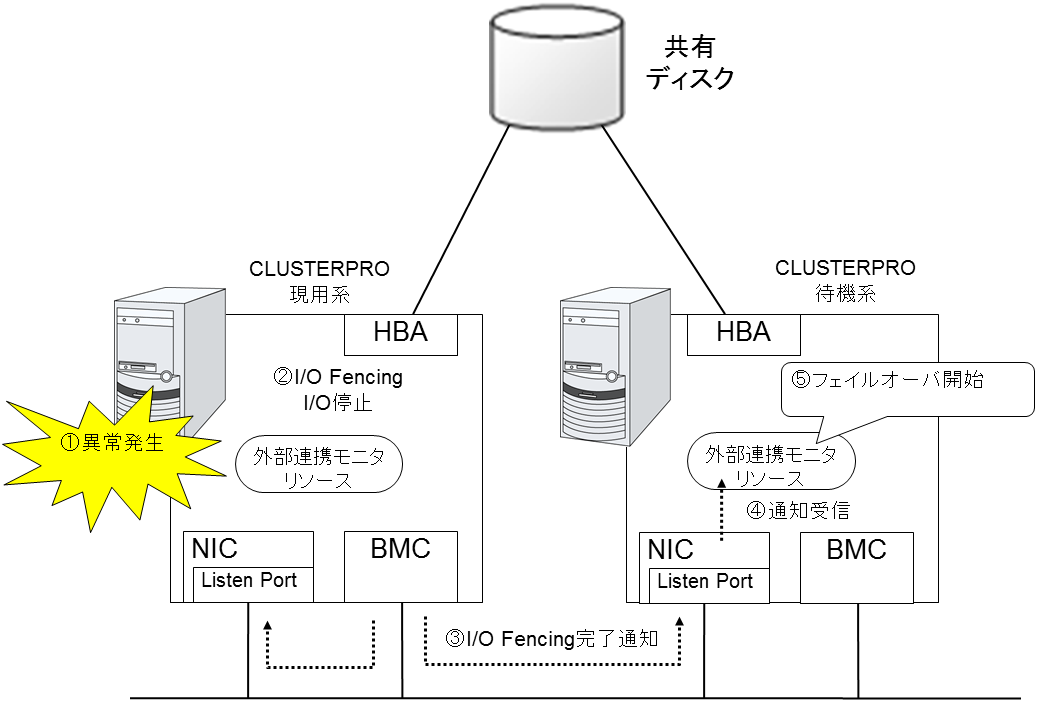 異常を検出した場合に I/O Fencing を実行し、 BMC による SNMP Trap 送信によってI/O Fencingの完了を待機系のマシンに通知します。通知を受け取った待機系マシンは I/O Fencing が成功したマシンを停止したものとして扱い、フェイルオーバグループを活性します。この連携によりハートビートタイムアウト時間や異常を検出したマシン上での非活性処理時間を短縮し、業務の引継ぎにかかる時間を短縮します。