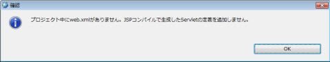 Servlet2.4の動的Webプロジェクトの「WEB-INF」配下にweb.xmlが存在しない場合、JSPコンパイルを実行すると、以下の確認ダイアログが表示されます。