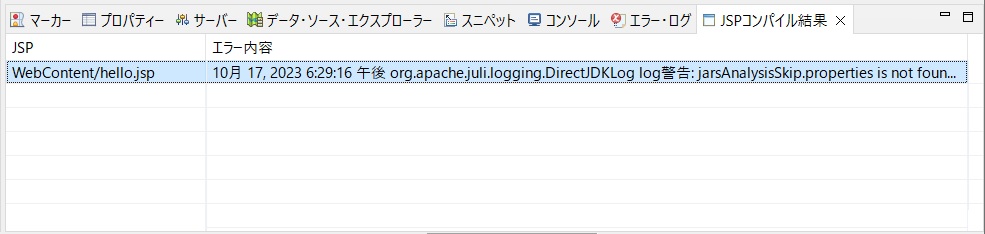 JSPコンパイル結果ビューに表示されたエラー項目をダブルクリックすると、対応するJSPファイルがエディターで開きます。