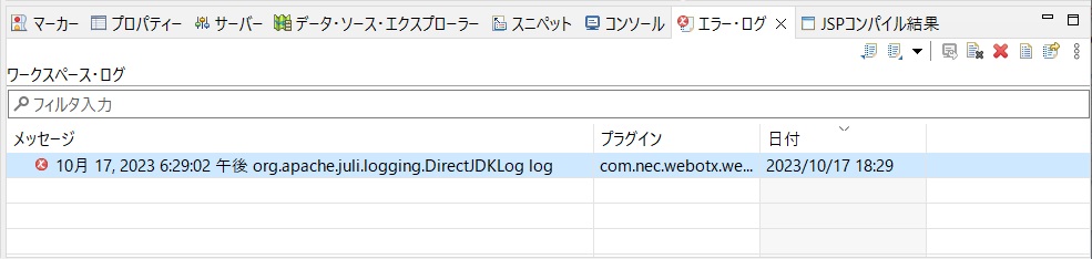 JSPコンパイルでエラーが発生すると、以下のJSPコンパイル結果ビューおよびエラー・ログビューが開き、エラー情報が表示されます。