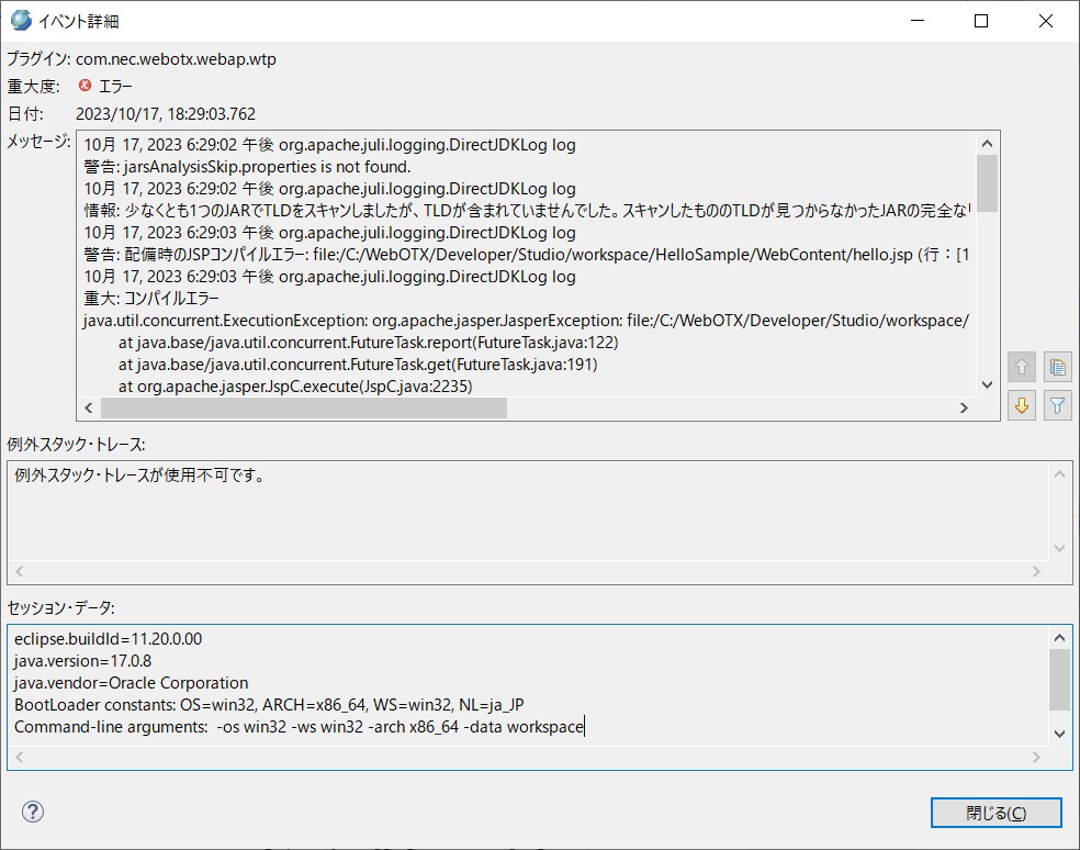 エラー内容を確認する場合は、エラーログビューに表示されたエラー項目のダブルクリックで表示されるイベント詳細ダイアログのメッセージエリアを確認してください。