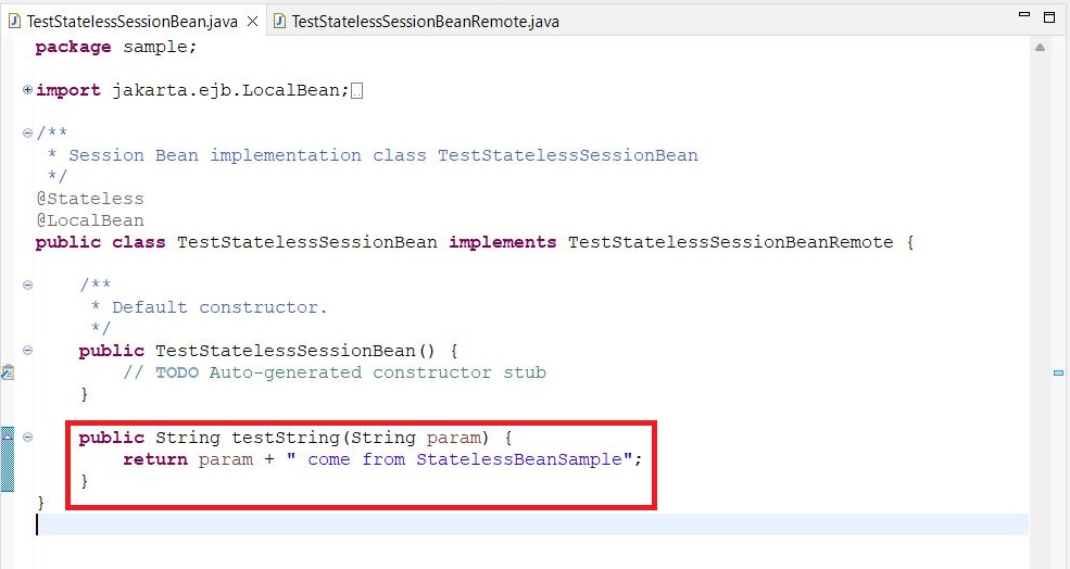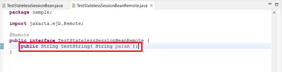 TestStatelessSessionBean.java (※ステートフルの場合:TestStatefulSessionBean.java、 Singletonの場合:TestSingletonSessionBean.java) に 次のビジネスメソッドを実装します。