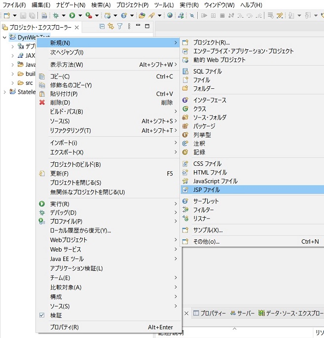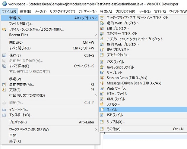 StatelessBeanSample (※ステートフルの場合:StatefulBeanSample、Singletonの場合:SingletonBeanSample) プロジェクトの右クリックメニュー新規 > ファイルを選択します。