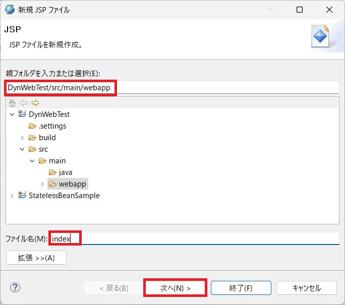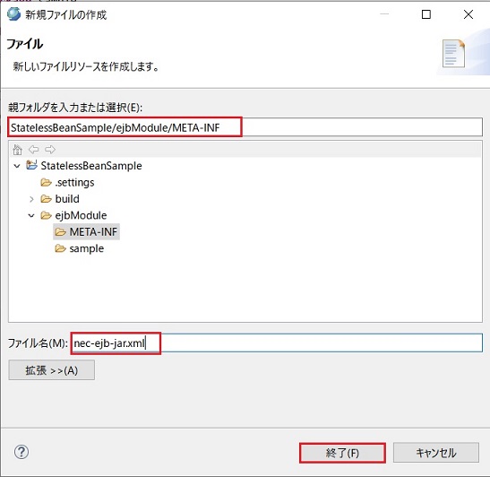 親フォルダーを入力または選択 の内容を「StatelessBeanSample/ejbModule/META-INF」とします。 (※ステートフルの場合:「StatefulBeanSample/ejbModule/META-INF」 Singletonの場合:「SingletonBeanSample/ejbModule/META-INF」)
