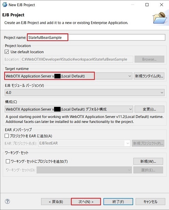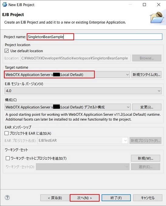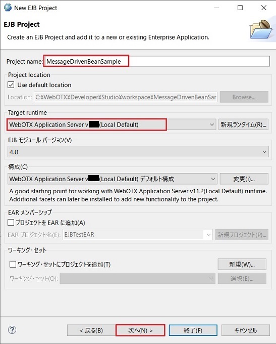 プロジェクト名に作成するプロジェクト名MessageDrivenBeanSampleを入力して、ターゲット・ランタイムにWebOTX Application Server <当該バージョン>(Local Default)を選択します。 次へ をクリックします。