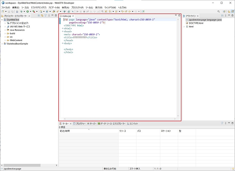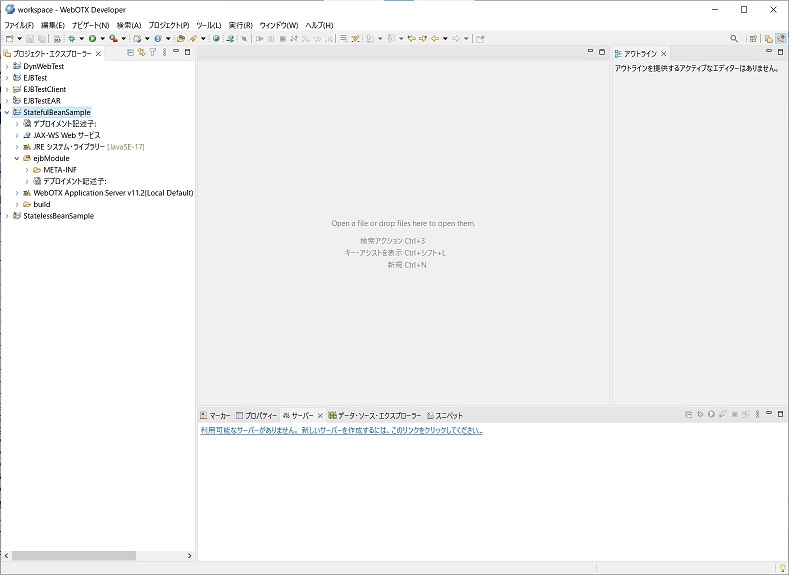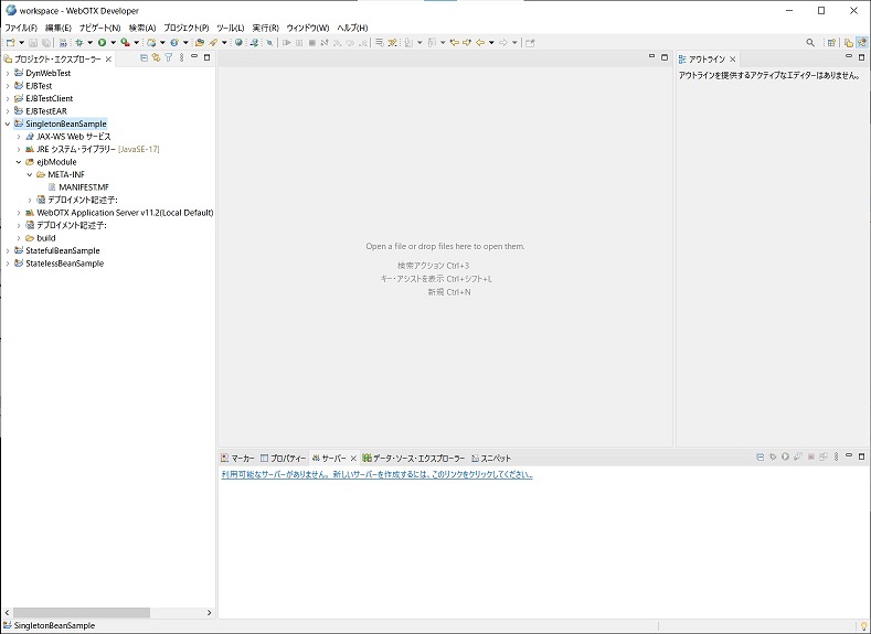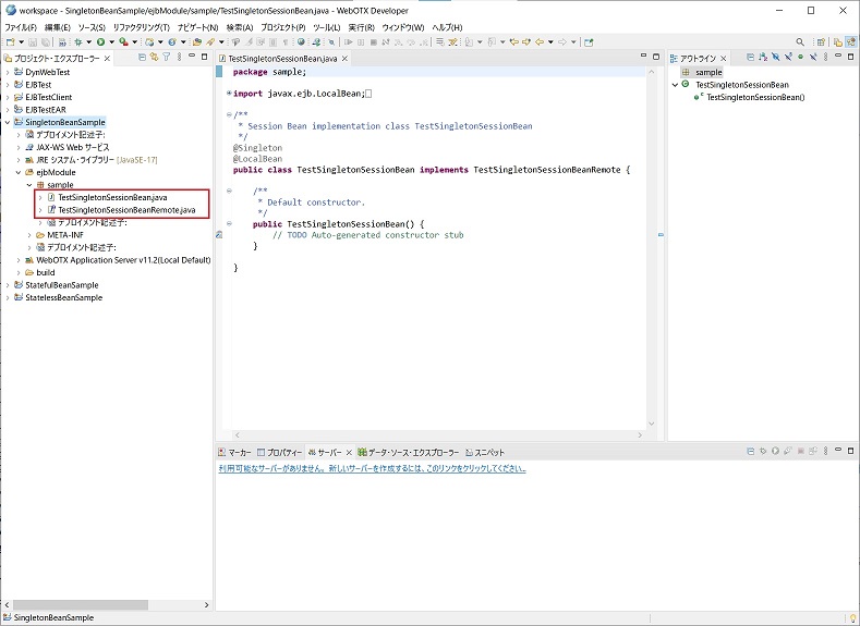 以降の、SingletonBeanSampleプロジェクトの、メソッド作成から、デプロイおよび動作確認に至る手順は、 前述のステートレスセッションBeanでの、EJBメソッドの作成 〜 ステートレスセッションBeanの実行(Webアプリケーションからの呼び出し)と同様ですので、そちらを参照してください。