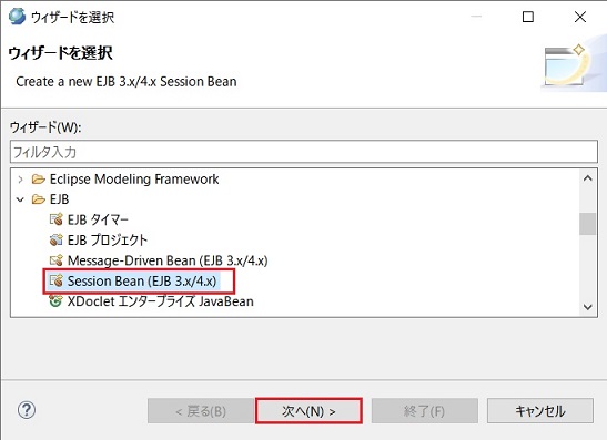 EJB > セッション Bean(EJB 3.x/4.x) を選択して、次へ をクリックします。