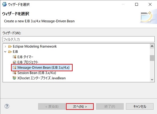 EJB > メッセージ駆動型 Bean (EJB 3.x/4.x) を選択して、次へ をクリックします。